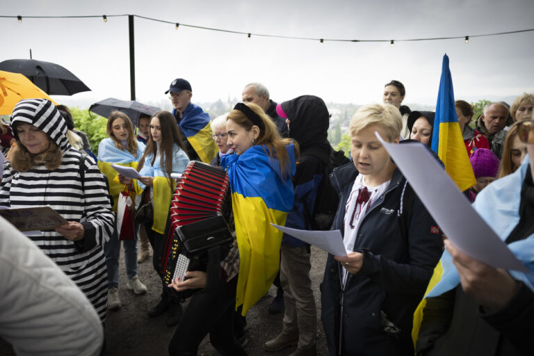 Fluechtlinge aus der Ukraine singen die Ukrainische Nationa ...