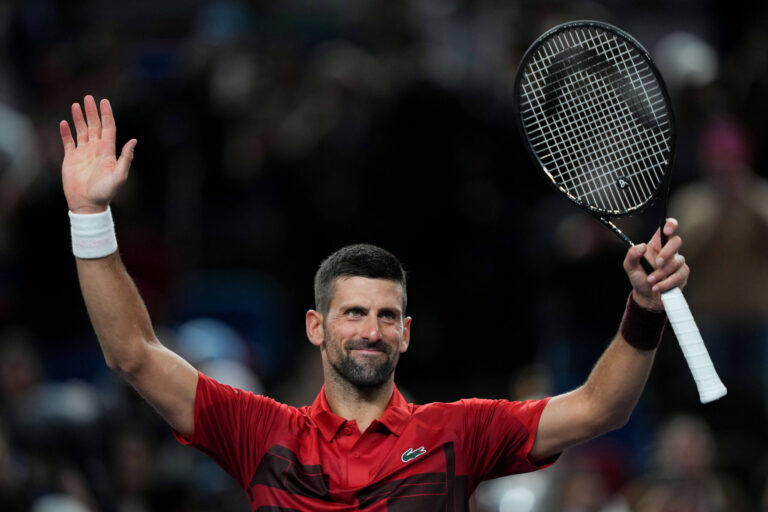 Novak Djokovic hält sein Kinn hoch und blickt grinsend zum Himmel. Als ob er dort etwas erkennen kann, was seine Gegner niemals erfahren werden und ihn auch heute unschlagbar machen wird.