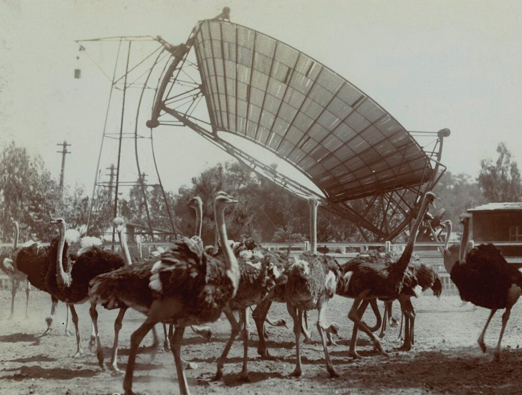 Auf einer Straussenfarm in Süd-Pasadena im Sonnenland Kalifornien hat man das nun mit Hilfe eines Sonnenmotors versucht. Diese Sonnenmaschine sammelt und steigert die Kraft der auffallenden Strahlen des Gestirns, indem sie diese in einem gewaltigen Hohlspiegel in Form eines abgestumpften Kegels auffängt. Dieser Hohlspiegel ist aus über siebzehnhundert kleinen Spiegeln zusammengesetzt, die so angeordnet sind, dass sie die Strahlen der in der Achse des Spiegels stehenden Sonne sämtlich nach einer Richtung hinwerfen.