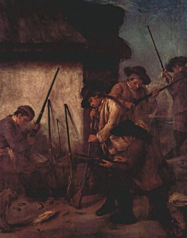 Pietro Longhi, Le chargement des armes, vers 1770 – Il n'est pas facile de dire quand exactement l'armement du monde a commencé. Il y a trois millions d'années, il y avait des pierres et des bâtons pour la chasse et l'autodéfense. Une guerre armée était encore très lointaine. Non seulement parce que l'homme préhistorique était, comparé à aujourd'hui, un être relativement pacifique. Mais il y avait trop peu d'hommes, suffisamment de ressources, et l'ennemi était l'animal. Eskalation und Deeskalation. ...