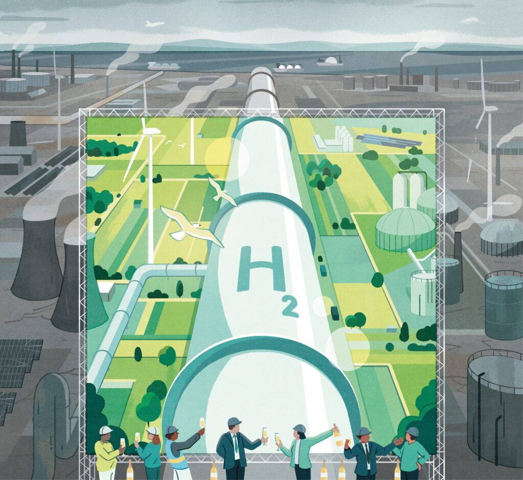 In diesem Lager zählte «grüner Wasserstoff» zu den wichtigsten Trumpfkarten. Die Idee ist attraktiv, Wasser unter Einsatz von Solarenergie «grün» aufzuspalten in Wasserstoff und Sauerstoff und dann den Wasserstoff im Zuge der Knallgasreaktion mannigfaltig als sauberen Antreiber zu nutzen. Wie in diesem Heft vom Journalisten Oliver Stock beschrieben, stellte die deutsche Ampelregierung mit Wirtschaftsminister Robert Habeck 2024 den Wasserstoff als zentrales Instrument vor, um Deutschland bis 2045 zu einem klimaneutralen Industrieland zu machen, mit netto null Treibhausgasausstoss. Wasserstoff sei der Champagner der Energiewende, hiess es.